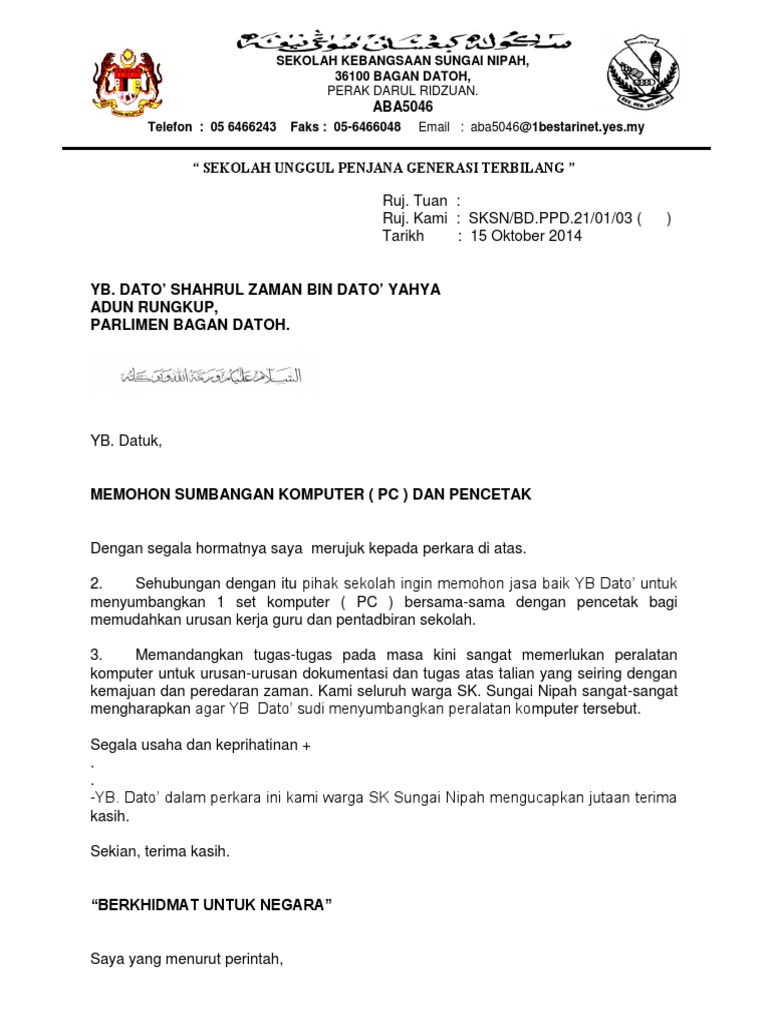 Panduan cara dan contoh untuk menulis format surat rasmi bagi memohon peruntukan atau sumbangan sebagai rujukan anda. Guru Penolong Kanan Pentadbiran Sekolah Kebangsaan Sri Wangi Jalan Gambut 25000 Kuantan Pahang Darul Makmur. Persatuan ibubapa dan guru kod sek.